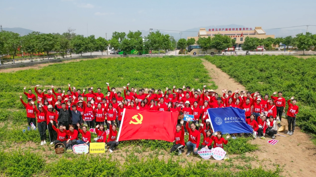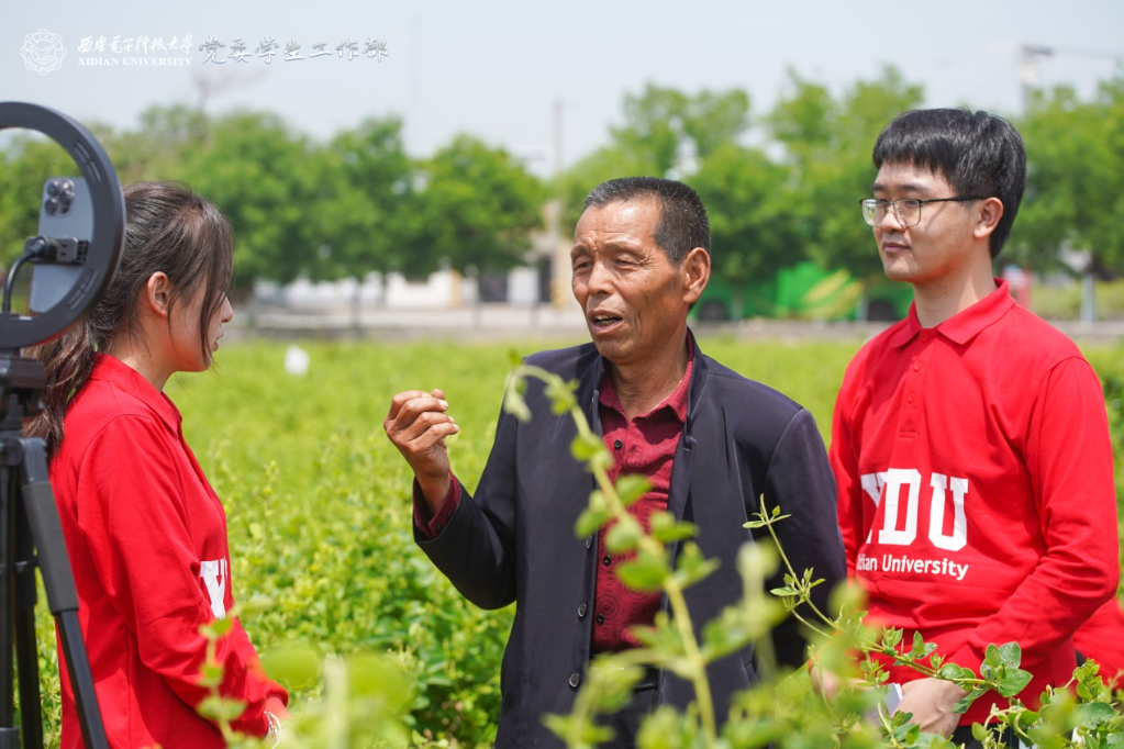 “直播間里的觀眾朋友們大家好,這里是西安電子科技大學‘田間地頭上黨課,金銀花地話振興’的活動現場……”大學生黨史校史宣講團的孔慶鈺在鏡頭前熱情地向大家介紹,“我手中的這朵花大家認識嗎?可別小瞧它,它可是鄉親們脫貧致富的金鑰匙,是駐村干部帶領鄉親走中國特色減貧道路上的智慧結晶……”