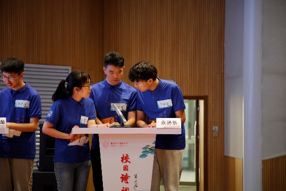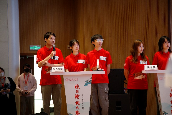 經過初賽、復賽的層層選拔,18名同學進入決賽環節。決賽分為群英薈萃(詩詞對對碰)、大浪淘沙(詩詞小劇場)、誰與爭鋒(詩詞線索題)和巔峰對決(飛花令)四輪進行,采用本科生、研究生混合組隊答題形式進行比賽。