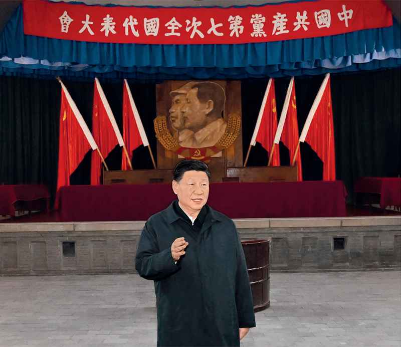 2022年10月27日,中共中央總書記、國家主席、中央軍委主席習近平帶領中共中央政治局常委李強、趙樂際、王滬寧、蔡奇、丁薛祥、李希,瞻仰延安革命紀念地。這是習近平在楊家嶺瞻仰中共七大會址。新華社記者 燕雁/攝