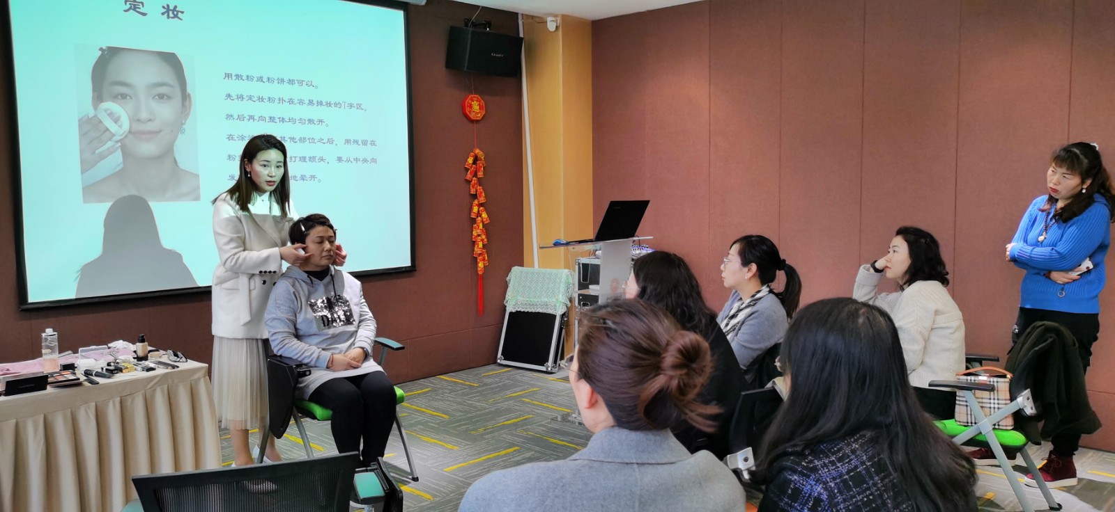 陳蕾老師長期從事形象管理美育工作,在色彩、服飾搭配、美容美發等方面具有很深的造詣,她以生動形象的語言,從職場精致妝容打造及五官修飾、實戰搭配技巧掌握及個人與服飾用色關系等2方面進行了講授,并通過現場演示詳細講解了化妝步驟和要點。