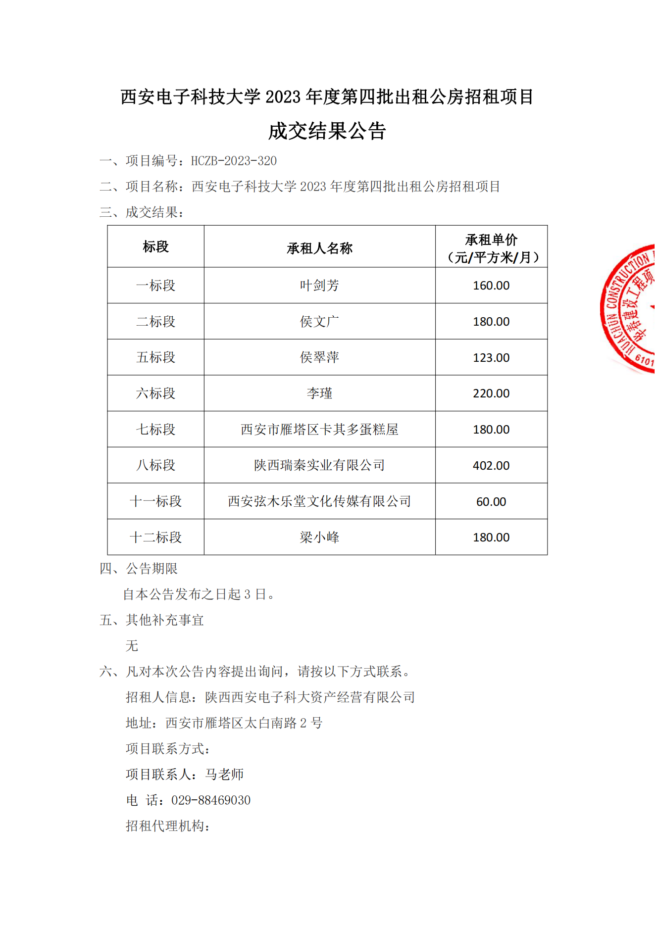 西安電子科技大學2023年度第四批出租公房招租項目成交結果公告